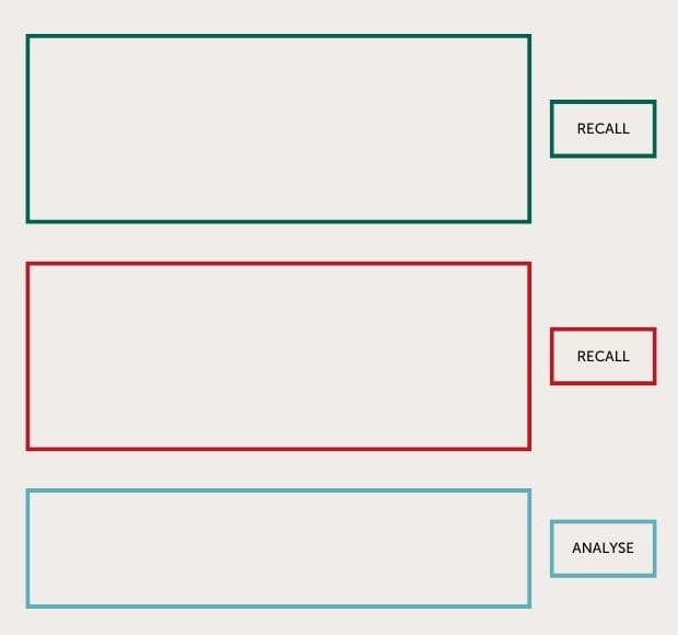 One way in which to integrate low-stakes quizzing into lessons is to begin every lesson with a retrieval task based on previously learned material. The above format, waiting for the students on the board as they enter the classroom, covers material from the last lesson (green), the previous topic (red) and then a longer, more analytical question (blue). [Figure 1]