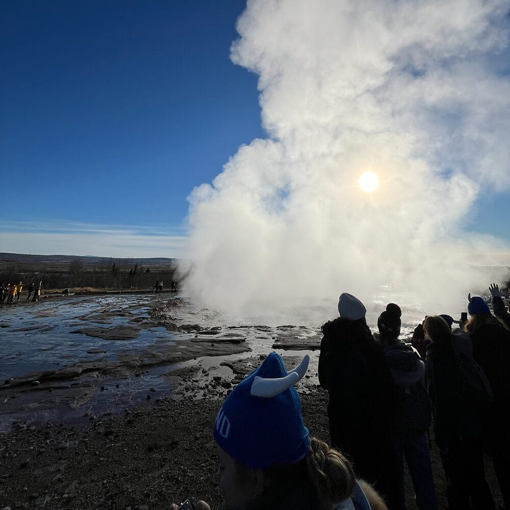 The trip began at the Secret Lagoon, Iceland’s oldest natural hot spring, where we observed geothermal activity. We then explored the Golden Circle, including Gullfoss waterfall and the Strokkur geyser. At Thingvellir National Park, students saw tectonic plates meet and looked into one of the park’s fissures. That evening, we had the opportunity to see the northern lights.