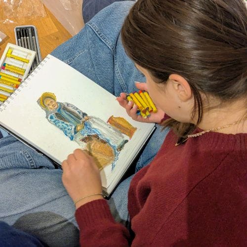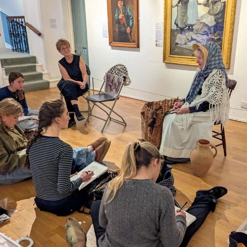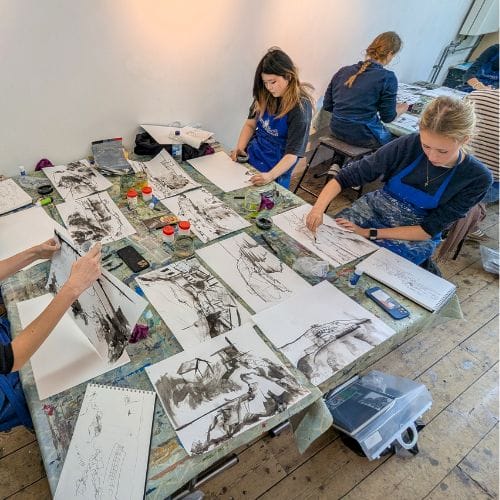 On the first day, the group travelled to Penzance to visit the Penlee House Museum and Gallery. There, they sketched a “fish wife” from observation and learnt about the history and influence of the artists in the Newlyn School of Art. A particularly memorable moment was speaking with a visitor whose relative had modelled for many well-known paintings of that era. Afterwards, the students visited the Newlyn Gallery, exploring Hew Locke’s large-scale sculptural installation Armada, a striking collection of boats of all shapes and sizes. Using a variety of materials, they carried out a series of creative exercises inspired by this work.