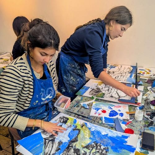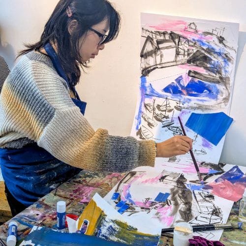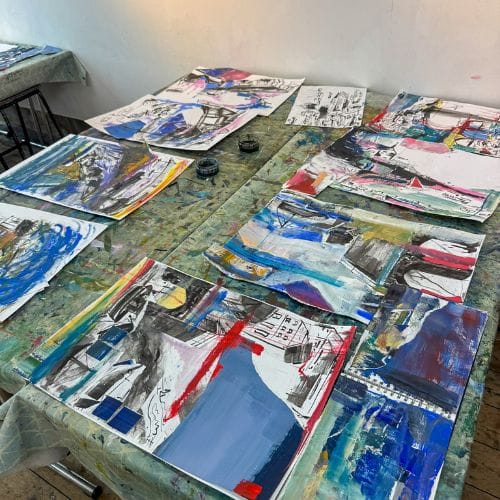 The second day was spent entirely at the St Ives School of Painting, in a workshop led by local abstract landscape artist Laura Kent. She introduced the students to her processes, drawing inspiration from Cornwall’s land and seascapes. After making several sketches around the town and its beaches, the group returned to the studio to develop them further. They enlarged their compositions with ink, then ripped each piece up to reconstruct their work into even larger collages. Layers of painted paper and acrylics were added, resulting in bold, abstract pieces that reflected both landscape and imagination.