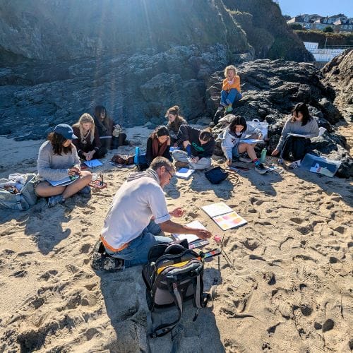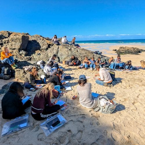 On the third day, the group toured Tate St Ives, encountering a broad range of works, particularly those by artists such as Barbara Hepworth, who moved to St Ives after the Second World War. They also visited a temporary exhibition by contemporary artist Lilian Lijn, whose innovative use of light and movement made a strong impression. Later that day, the group headed to the beach for an outdoor painting session with landscape artist Greg Humphries. Working “en plein air,” they learnt watercolour techniques including wet-on-dry layering and glazing, before moving towards more expressive and abstract interpretations capturing the mood and energy of the beach.